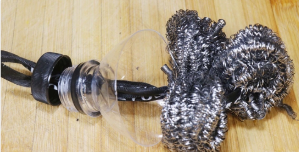 3. Po przywiązaniu trzech stalowych płuczek wełnianych przejdź oba końce liny bezpośrednio przez usta butelki. Spróbuj zaostrzyć linę w jak największym stopniu. Następnie przejdź oba końce liny przez dwa otwory wysadzone wcześniej w butelce. Następnie dokręć linę, a następnie wkręć zakręcanie butelki z powrotem na usta butelki. Następnie zawiąż węzeł w linie, która przepływa przez butelkę, aby zawiązać i mocno naprawić stalowe płuczki wełniane. Zaleca się związać martwy węzeł, aby stalowe płuczki wełniane się nie poluzowały. Następnie zawiąż kolejny węzeł na końcu liny, aby po użyciu można było zawiesić stalowe płuczki wełniane.