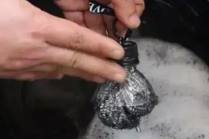 4. W ten sposób ukończono szczotkę do garnka wykonaną z opuszczonej butelki napojów. Sprawdźmy to i zobaczmy, jak to działa. Następnie dodaj odpowiednią ilość wody i odpowiednią ilość mydła naczyń do patelni. Po prostu przytrzymaj mocno czapkę butelek i szoruj patelnię. Ponieważ trzy stalowe płuczki wełniane są ściśle związane ze sobą, stalowe płuczki wełniane wywierają na siebie siłę, a część zewnętrzna jest owinięta butelką napojów, więc nie zmieni się z powodu siły podczas użycia. Dlatego w ogóle nie będzie się trząść podczas użytkowania, a powierzchnia czyszczenia jest znacznie większa niż w przypadku jednej kuli czyszczącej. Jest o wiele bardziej przydatny niż użycie tylko jednego ze stalowego płukacza wełnianego. Co więcej, nasze ręce nie muszą dotykać mydła naczyń ani plam oleju, a nawet nie musimy dotykać wody. Ten stalowy płuczek wełniany wykonany w ten sposób jest szczególnie praktyczny. Po umyciu garnka musimy tylko spłukać płukanie wełniane pod kranem i wstrząsnąć nim.