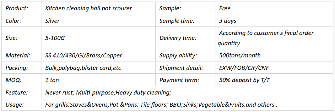 1. Zwiększ wszelkiego rodzaju produkty czyszczące, takie jak Scorer ze stali nierdzewnej, ocynkowany scorer, mosiężny scorer, siatkowy scorer, gąbka kuchenna, podkładka do szorowania, szczotka do garnka, szczotka do butelek, ręczniki czyszczące itp.